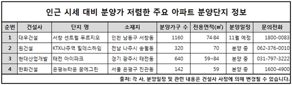 대우건설은 오는 11월 인천 남동구 서창2지구 5BL에 ‘서창 센트럴 푸르지오’를 분양한다. 사업부지를 LH가 제공함에 따라 평균 분양가는 주변보다 저렴하게 책정될 전망이다. 지하 1층부터 지상 22층~25층 규모의 아파트 10개 동, 1160가구 규모로 조성된다.