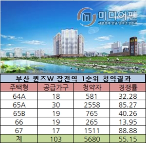 | ▲ 4일 금융결제원 아파트투유에 따르면 부산 퀸즈W 장전역 1순위 청약결과 평균 55.15대 1의 경쟁률로 전 주택형이 마감돼 부산 분양시장의 열기를 지속했다. |