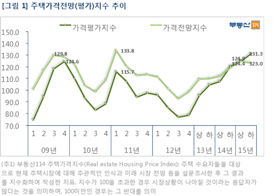 부동산114는 수도권 거주자(20세 이상 성인남녀) 313명을 대상으로 ‘2015년 하반기 주택거래소비자 인식조사’를 실시한 결과, 6개월 전 대비 현재 가격 수준을 평가하는 ‘주택가격평가지수’가 131.3으로 나타났으며, 2007년 이후 역대 두번째를 기록했다고 5일 밝혔다. 역대 최고치는 2007년 1분기 142.3였다.