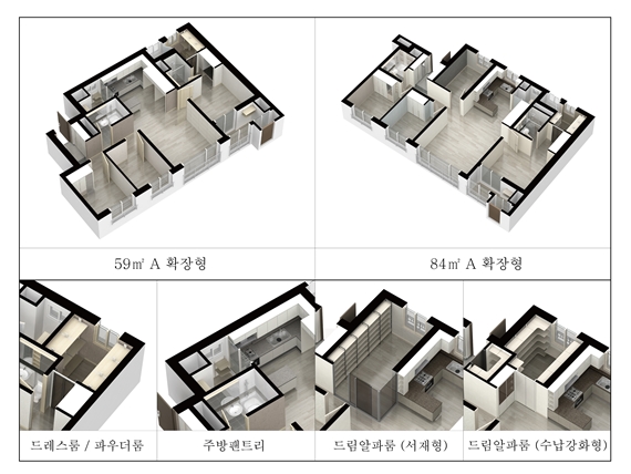 전용 면적 59㎡는 소형평형이지만 계절의류 등 의류수납이 가능한 드레스룸을 제공한다. 84㎡A는 알파룸을 제공해 입주자의 취향에 따라 서재형이나 수납강화형으로 선택 가능하다.