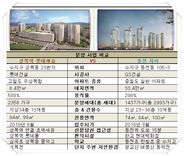 용인수지 부동산 관계자는 “초역세권 메리트 때문에 성복역 롯데캐슬은 투자자들의 관심이 높다”며 “프리미엄은 보장하지만 쾌적성 측면이나 미래가치 측면에서는 동천자이가 낫다”라고 답한 뒤 연이어 들어오는 손님을 맞으러 일어섰다.
