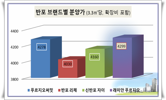 지난 10월 반포 삼호가든멘션 4차를 재건축해 분양한 반포 센트럴 푸르지오 써밋 전용 84㎡B 타입 17층 이상 기준 3.3㎡ 당 분양가 4278만원으로 역시 발코니 확장비가 포함됐다. 두 단지를 놓고 비교했을 때 반포 래미안 아이파크 가격이 더 높다.