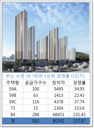 2일 금융결제원 아파트투유에 따르면 부산 수영 SK 뷰 1단지는 582가구 모집에 8만241명이 청약 접수해 평균 청약 경쟁률 137.87대 1로 1순위 마감에 성공했다.