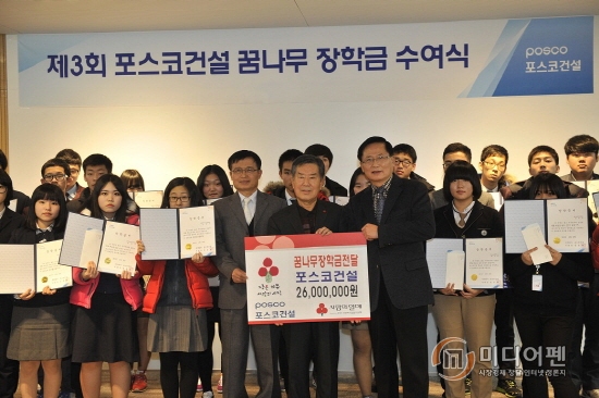 포스코건설은 31일 인천 송도사옥에서 저소득층 가정의 학생들을 위해 '꿈나무 장학금' 2,600만원을 전달했다고 밝혔다.