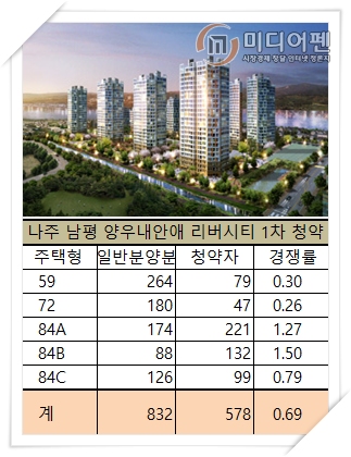 [미디어펜=이승혜 기자]전남 나주시 남평 도시개발사업지구 ‘양우내안애 리버시티 1차’가 전 주택형 1순위 청약 마감에 실패했다.