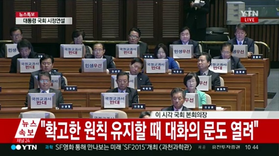 | ▲새정치민주연합 의원들은 27일 박근혜 대통령 국회 시정연설에서 '국정교과서 반대', '민생우선' 등이 적힌 피켓을 들고 연설 내내 침묵으로 일관했다./사진=YTN 뉴스 캡처 | ||