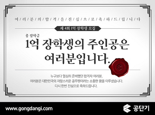 공단기는 수험생이 작성한 합격 수기를 심사해 최종 합격자를 발표할 예정이며 총 1억원의 장학금을 지급한다.