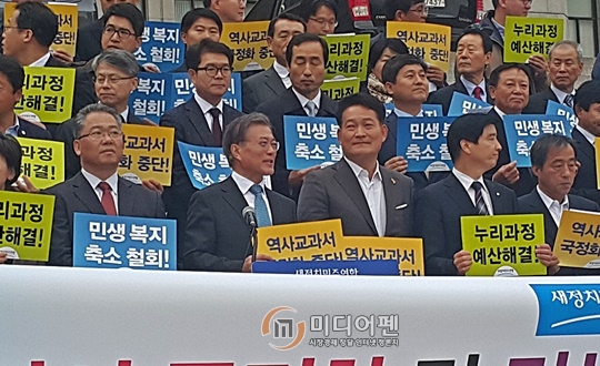 | ▲ 송영길 전 인천시장이 9일 오전 국회 본청 앞에서 열린 ‘역사교과서 국정화 및 민생복지 축소 저지 결의대회’에 참석해 문재인 대표와 인사를 나누고있다./사진=미디어펜 | ||