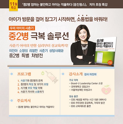 서울 구로구 비상교육에서 진행되는 이번 특강에는 이진아 브랜드유리더십센터 소장이 ▲사춘기와 중2병의 관계 ▲중2병의 특징 및 10가지 유형 ▲시기별 부모역할 이해 ▲사춘기 자녀와 소통하기 등에 대한 내용을 전달할 예정이다.