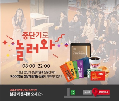 행사 참가자에게는 강좌 할인권, 영화 예매권, 무료 수강권 등이 증정되는 ‘중단기로 놀러와’에 대한 자세한 내용은 중단기 홈페이지를 통해 확인할 수 있다.