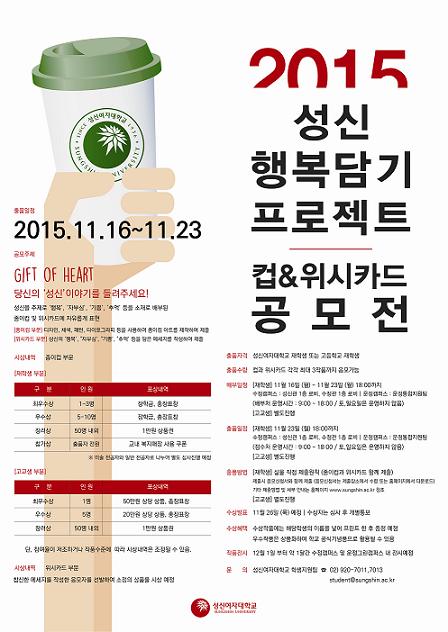 ‘2015 성신 행복담기 프로젝트’ 일환으로 마련된 이번 공모전의 응모자격은 성신여대 재학생 및 고교생이다.