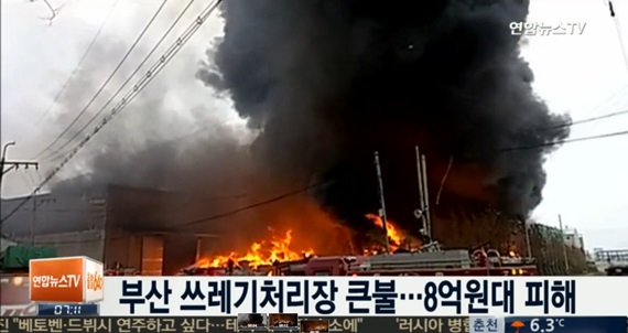 | ▲ 부산환경자원공원사업소에서 화재가 발생, 8억원대의 재산피해가 있었던 것으로 알려졌다.연합뉴스TV 뉴스화면 캡처. |