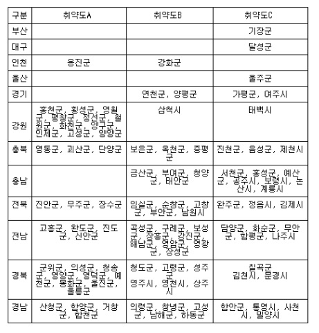 대부분 농어촌 군지역이지만, 여주·삼척·태백·제천·공주·보령·논산·계룡·남원·정읍·김제·나주·영주·영천·상주·김천·문경·통영·사천·밀양 등 도농복합지역의 20개 시도 포함됐다.