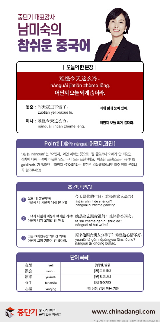 [남미숙의 참 쉬운 중국어]-"어쩐지 오늘 되게 춥더라"