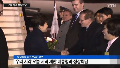 | ▲박근혜 대통령이 프랑스 파리 방문 일정을 마치고 1일(현지시간) 오후 비세그라드 그룹(V4, 체코·폴란드·헝가리·슬로바키아) 정상회의 개최지인 체코 프라하에 도착했다. /사진=YTN 방송화면 |