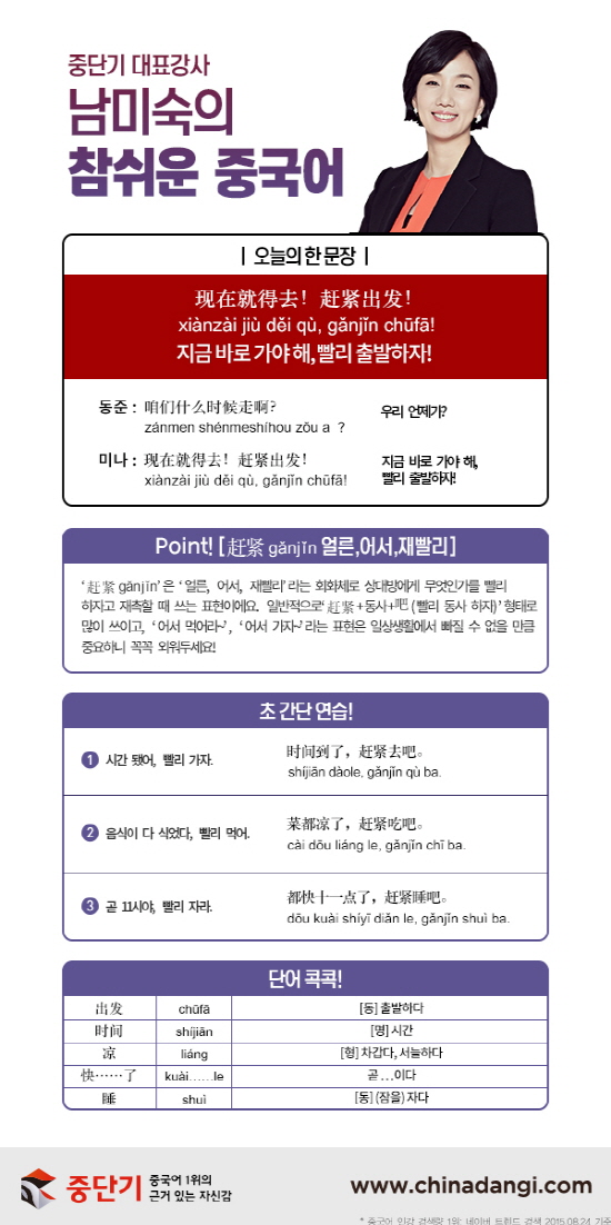 [남미숙의 참 쉬운 중국어]-"지금 바로 가야 해, 빨리 출발하자!"