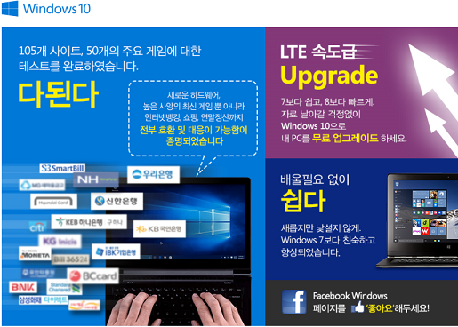 | ▲ 한국마이크로소프트(한국MS)는 국내 주요 금융권과 온라인 쇼핑몰, 공공기관 등 총 105개 웹사이트(인터넷 익스플로러 11 기준)에서 윈도10 호환성을 시험한 결과 모두 통과했다고 7일 밝혔다./사진=MS홈페이지 |