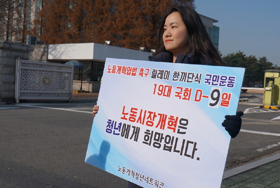 | ▲ 노동개혁청년네트워크의 청년이여는미래 신보라 대표가 1일 국회앞에서 노동개혁입법을 촉구하는 1인 릴레이를 벌이고 있다./사진=노동개혁청년네트워크 |