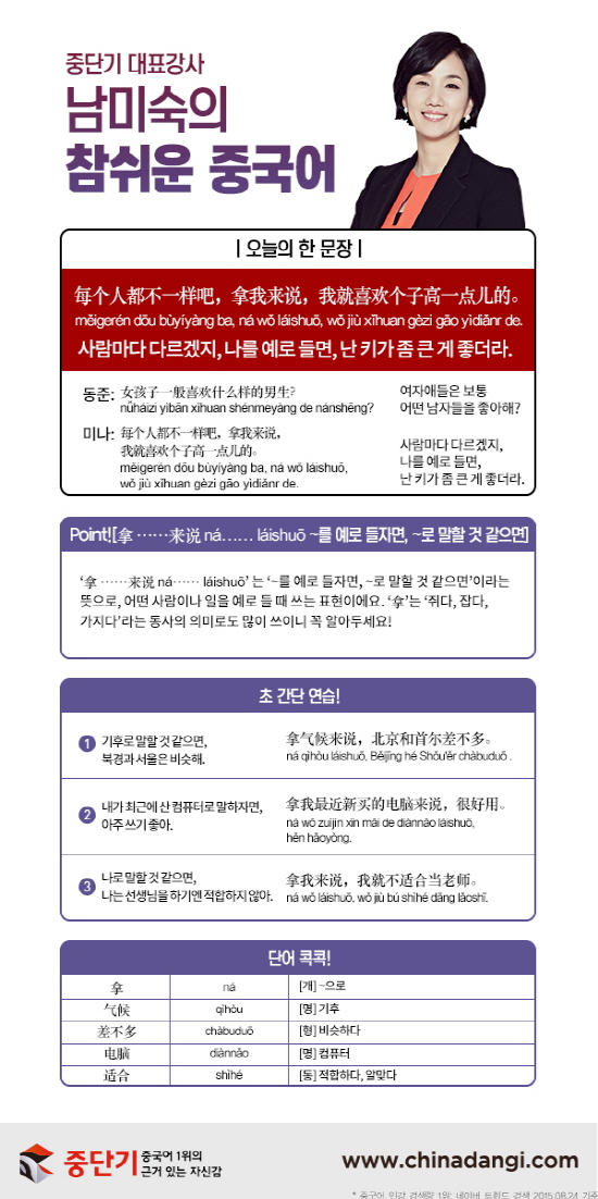 [남미숙의 참 쉬운 중국어]~를 예로 들자면·~로 말할 것 같으면