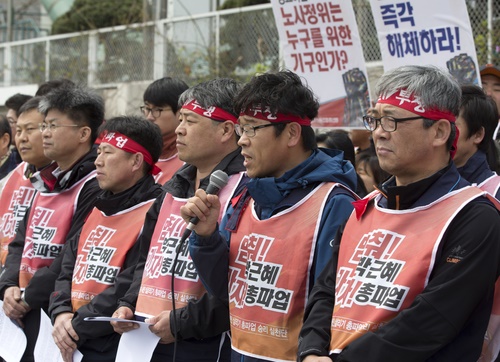 | ▲ 현대자동차 노조(위원장 박유기)가 15일 임단협 교섭을 재개하고 교섭을 마친 후 민주노총 총파업 동참 여부도 정하기로 했다. 사진은 시위 중에 있는 민주노총 지도부./사진=연합뉴스 |