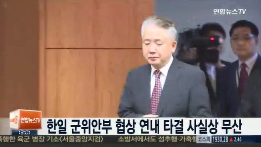 | ▲ 이상덕 외교부 동북아 국장은 15일 도쿄 외무성 청사에서 이시카네 기미히로 일본 외무성 아시아대양주국장과 제11차 군위안부 문제 관련 국장급 협의를 개최했으나 연내 타결은 사실상 무산됐다./사진=연합뉴스TV 캡처 |
