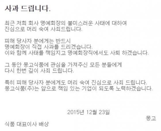 몽고식품은 대표이사 이름으로 올린 사과문에서 "저희 회사 명예회장의 불미스러운 사태에 대해 진심으로 머리 숙여 사죄드린다"고 밝혔다.
