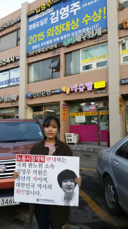 [미디어펜=온라인뉴스팀] 한국대학생포럼(회장 여명·이하 한대포)은 22일부터 사흘간 오후 4시30분부터 5시30분까지 김영주 의원(국회 환노위원장·새정치민주연합) 영등포 지역구 사무실 앞에서 일인 시위를 진행 중이다.