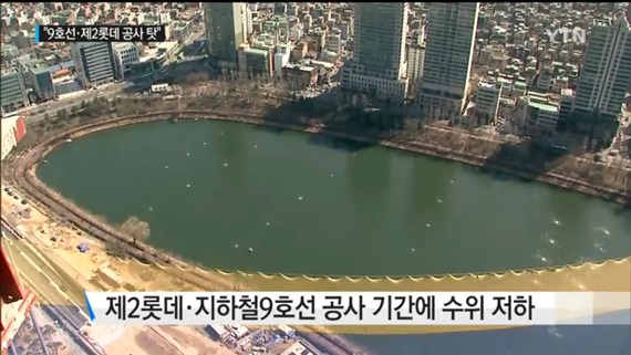 ▲ 송파구에서 조사 의뢰한 결과 석촌호수 수위 저하 원인이 지하철 9호선과 제2롯데월드의 영향이라는 분석이 나왔다.YTN 뉴스화면 캡처.