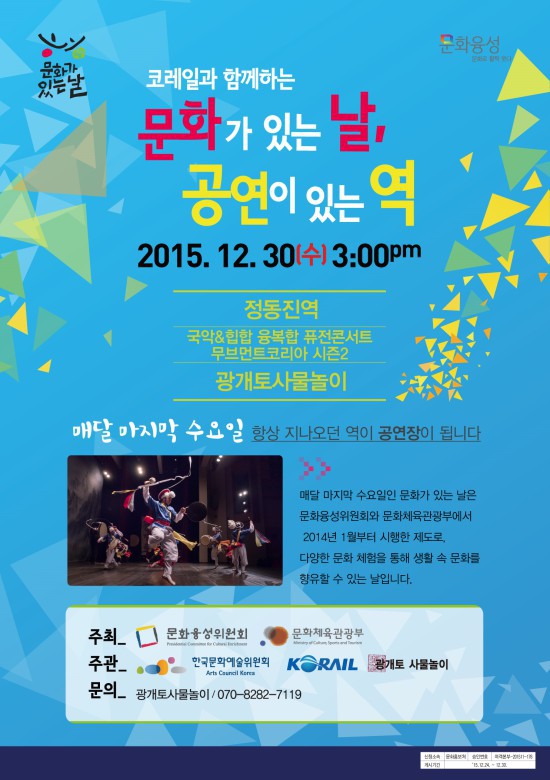 공연은 ‘문화가 있는 날, 공연이 있는 역’ 사업의 목적으로 마련되며, 문화융성위원회와 문화체육관광부 주최, 한국문화예술위원회, 정동진역, 광개토 사물놀이 예술단이 주관한다. 관람은 무료.