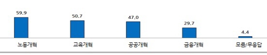 설문조사 결과 국민통합을 위해 가장 우선적으로 추진돼야 할 부문은 전 연령대에서 절반 이상이 ‘노동개혁’(59.9%)이라고 응답했으며, 이어 ‘교육개혁’(50.7%), ‘공공개혁‘(47%), ’금융개혁‘ (29.7%)순으로 나타났다.
