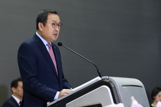 | ▲ 명지대학교 제10대 총장으로 취임한 유병진 총장이 취임사에서 총장 재선임에 대한 감사의 뜻을 전하고 있다./사진=명지대 제공 | ||