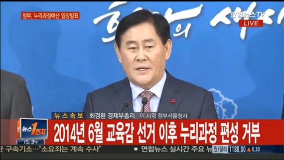 | ▲ 최경환 경제부총리 겸 기획재정부장관이 "시도교육감이 누리과정 예산을 미편성하는 것은 직무유기"라고 지적했다.연합뉴스TV 뉴스화면 캡처. |
