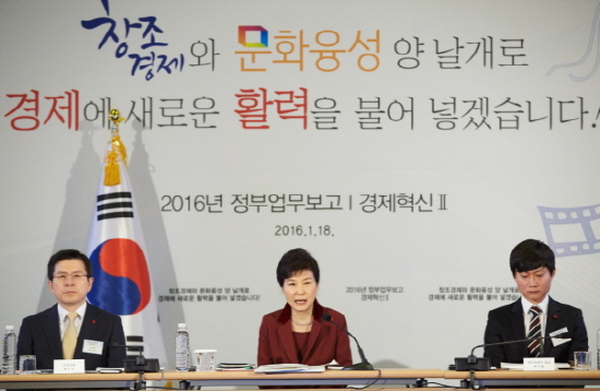 | ▲ 박근혜 대통령이 18일 판교 테크노밸리 차바이오컴플렉스에서 열린 '2016년 정부업무보고 경제혁신Ⅱ'에서창가문답(創可文答)이란 신조어를 사용 회의장 분위기를 화기애애하게 했다.. 창가문답은 ‘창조경제의 가시적 성과는 문화에 답이 있다’라는 의미다. /사진=청와대 홈페이지 | ||