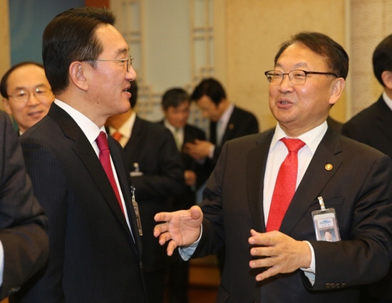 | ▲ 유일호 경제부총리(오른쪽)와 현기환 정무수석이 2일 오전 청와대에서 열린 제5회 국무회의 전 티타임에서 대화하고 있다. 현 수석은 이날 김종인 더민주 비대위원장이 보낸 박근혜 대통령의 64세 생신을 축하하는 난을 세 번이나 사절했다. /사진=연합뉴스 | ||