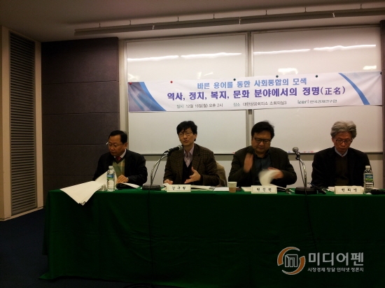 | ▲ 강규형(왼쪽에서 두번째) 명지대 교수가 16일 열린 한경연 주최 강연에서 종북세력의 용어혼란전술이 대한민국의 정체성을 부정하고 있다고 주장하고 있다. | ||