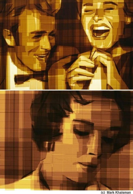 누런 빛의 테이프를 이어붙여 명암까지 적용해 마치 영화의 한 장면을 보는 듯한 포장 테이프 예술 작품은 그 자체로 특이한 아우라를 풍기고 있다.