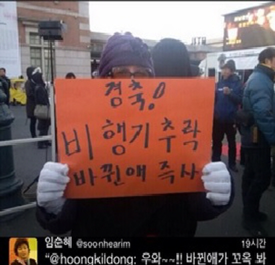 임순혜 위원은 18일 자신의 트위터에 '경축! 비행기 추락 바뀐애 즉사'(사진)라고 적힌 피켓을 들고 찍은 사진을 리트윗했다.