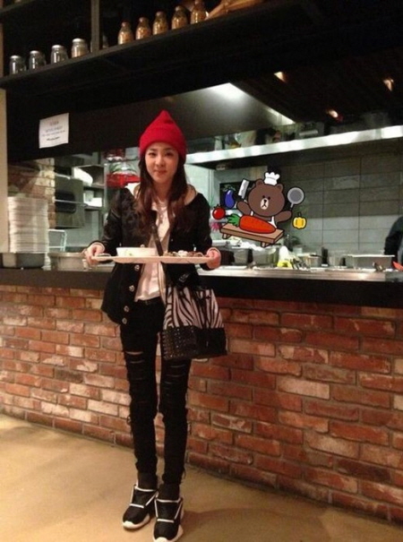 공개한 사진 속에는 산다라박이 YG엔터테인먼트 구내식당에서 식판을 들고 모습이 담겨있다. 산다라박은 트렌디한 패션감각을 발휘하며 바비인형 같은 몸매를 뽐내고 있다.