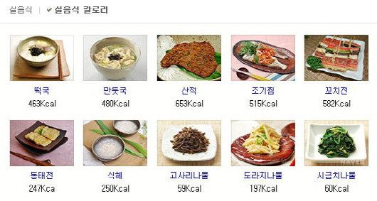산적 653㎉, 갈비찜 531㎉, 두부조림 430㎉, 잡채 306㎉, 조기찜 515㎉ 등이다. 또 후식으로 많이 먹는 식혜는 200mL 기준 250㎉이며 약과 172㎉, 사과 100㎉ 등인 것으로 알려졌다.