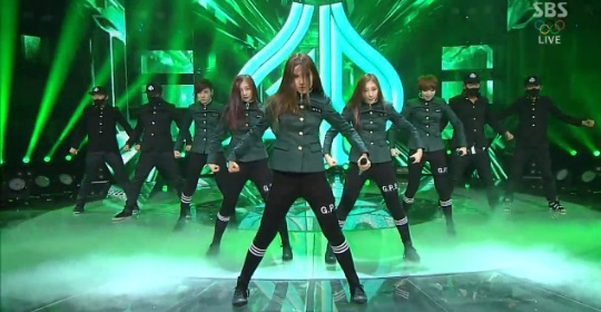 국방색의 남자 교련복을 입고 등장한 지피베이직은 다른 섹시 걸그룹과는 확실히 차별화된 모습으로 무대를 이끌었다.