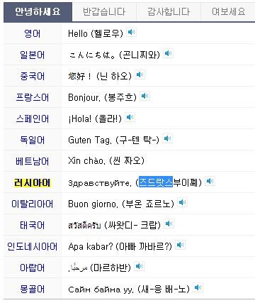 최근 한 포털 사이트에는 러시아 인사말이 베트남어, 태국어, 아랍어, 몽골어 등 나라별 인사말과 함께 게재돼 눈길을 끌었다.