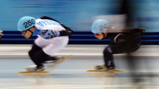 | ▲ 10일 오후(현지시간) 러시아 소치 해안클러스트 아이스버그 스케이팅 팰리스에서 열린 쇼트트랙 남자 1,500m 경기에서 한국 박세영(242번)과 러시아 안현수(250번)가 역주하고 있다./뉴시스 | ||