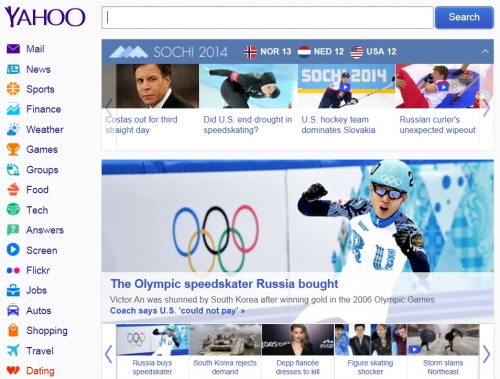 야후가 홈페이지에 러시아로 국적을 바꾸고 소치올림픽에서 맹활약하는 안현수를 크게 소개했다.