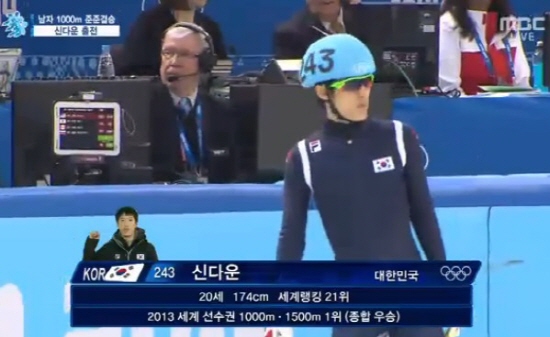 | ▲ 15일 러시아 소치 아이스버그 스케이팅 팰리스에서 열린 2014소치동계올림픽 쇼트트랙 남자 1,000m 결승에 진출한 신다운(21·서울시청)이 메달 획득에 실패했다./MBC 캡쳐 | ||