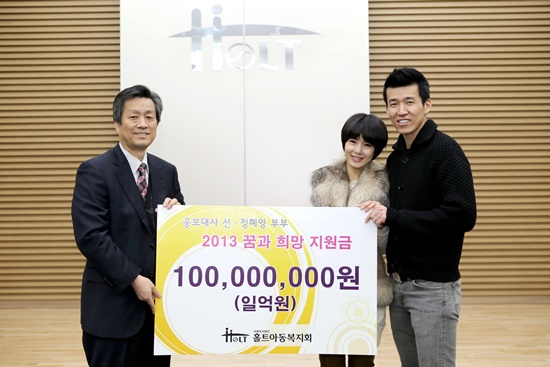 이들 부부는 19일 오전 10시30분 서울 마포구 합정동 홀트아동복지회 본부 강당에서 '2014 꿈과 희망 지원금' 1억원을 기부할 계획이다.
