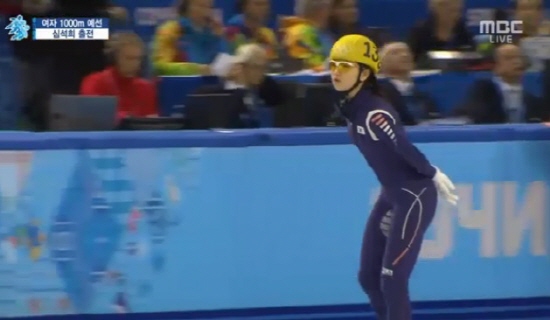 | ▲ 심석희 18일 러시아 소치의 아이스버그 스케이팅 팰리스에서 열린 2014 소치 동계올림픽 쇼트트랙 여자 1,000m 4조 예선에서 1위로 결승선을 통과했다./MBC 캡쳐 | ||