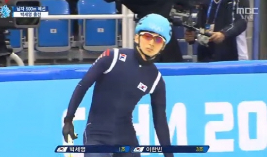 | ▲ 박세영은 18일 러시아 소치의 아이스버그 스케이팅 팰리스에서 열린 2014 소치 동계올림픽 쇼트트랙 남자 500m 1조 예선에서 1위로 결승선을 통과했다./MBC 캡쳐 | ||