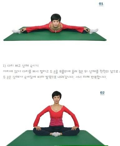 우선 자리에 앉아 다리를 펴서 벌리고 두 손을 무릎 위에 올려 놓은 뒤 상체를 천천히 앞으로 숙인다. 이런 동작을 서너 차례 반복하면 된다.
