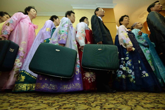 | ▲ 2014 설 계기 남북이산가족 상봉 2일차인 21일 오전 북한 강원 고성 외금강 호텔에서 북측 가족들이 남측 가족의 선물을 담기 위한 가방을 들고 개별상봉을 위해 이동하고 있다./뉴시스 | ||