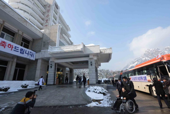 | ▲ 2014 설 계기 남북이산가족 상봉 2일차인 21일 오후 북한 강원 고성 금강산 호텔에서 열린 공동중식에 남측가족들이 입장하고 있다./뉴시스 | ||